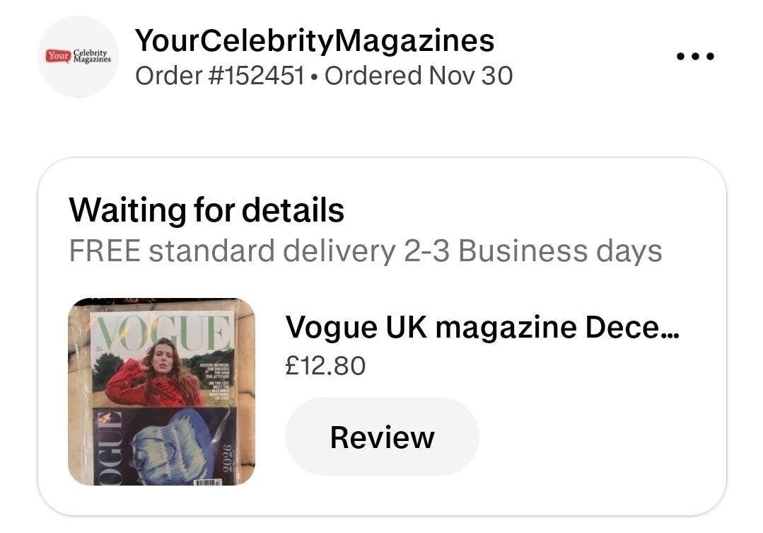 Delivery was meant to be 2 - 3 business days, I ordered this magazine on the 30th of November and I'm still waiting almost a month later!! And then have the audacity to email me asking how I'm enjoying the supposed magazine?! Absolute joke! Wouldn't recommend this website to get your magazines from