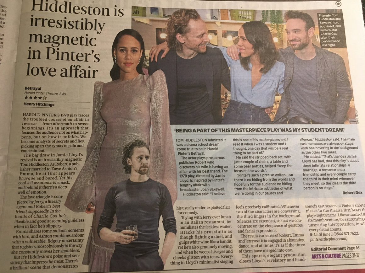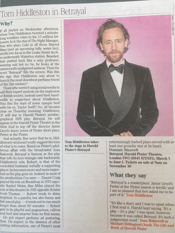 London Evening Standard 14th March 2019 - Brand New Condition Tom Hiddleston Superb feature with portrait and interview with Tom on Betrayal.
