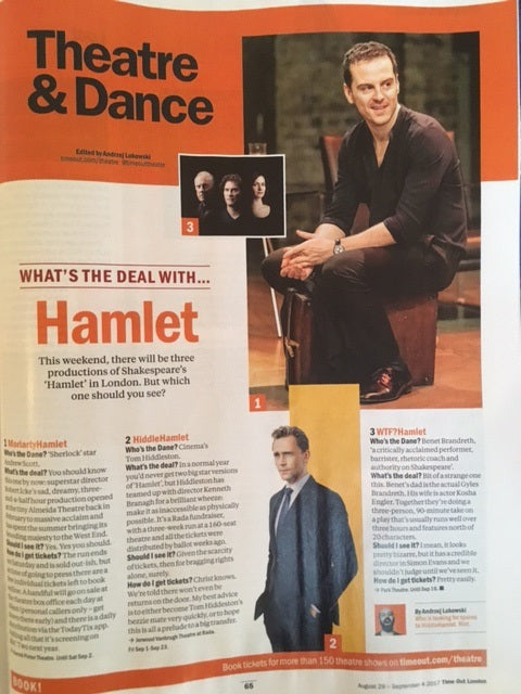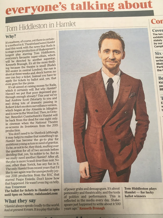 UK Times Review August 5 2017 - Brand New Condition - Tom Hiddleston Lovely portrait and nice article on Hamlet.