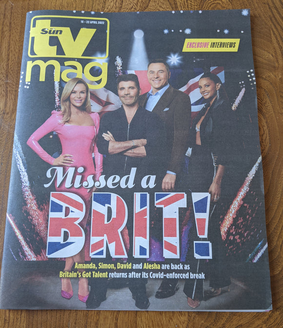 SUN TV Magazine 16th April 2022 - Brand New Condition BGT Cover story featuring Amanda, David, Simon and Alesha and interview inside with them all on the new series. PLUS...