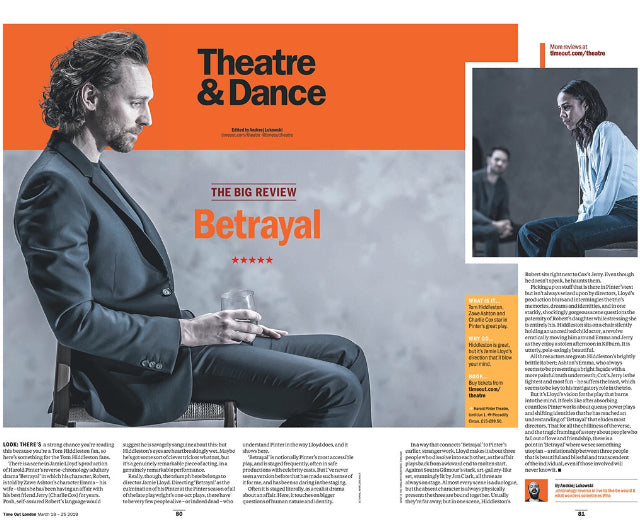The anticipation is over! Tom Hiddleston returns to the stage in Betrayal. The most important publication for London theatre reviews, Time Out London gives in depth verdict with stunning portraits of Tom Hiddleston inside.